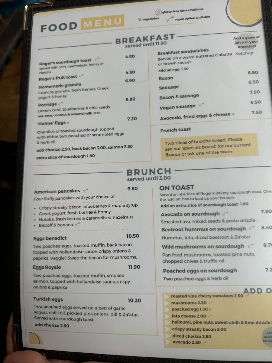 Overall, the menu at Holme Coffee House - Penistone offers a simple yet satisfying selection that leans into comforting, familiar choices. The breakfast options like Porridge and Toast With Jam Or Nutella provide a classic, cozy start to the day, while the drinks range-from Milk Bottle and Apple Juice to Hot Chocolate, Apple & Blackcurrant, and Orange Juice-complement the food nicely without overwhelming the menu. The “Others” section adds a bit more substance, with items such as the Bacon Panini, Chipotle Chicken Panini, Yorkshire Ham Panini, and Grilled Cheese Sourdough, all of which feel hearty and well-suited for a casual café setting. The inclusion of the Buddha Bowl also brings a welcome lighter, more wholesome option. While the absence of listed prices leaves some curiosity, the overall impression is of a straightforward, approachable menu that prioritizes comfort and variety without unnecessary complexity.